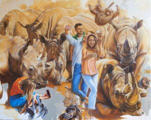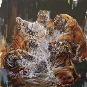 Le sue tele non sono semplici rappresentazioni, ma corto-circuiti simbolici, che con eleganza compositiva e cura dei dettagli dimostrano una grande libertà espressiva. Tigri, scimmie e altra creature diventano quindi metafore di forza, vulnerabilità e bellezza, in un dialogo visivo che esplora le similitudini tra uomo e natura.